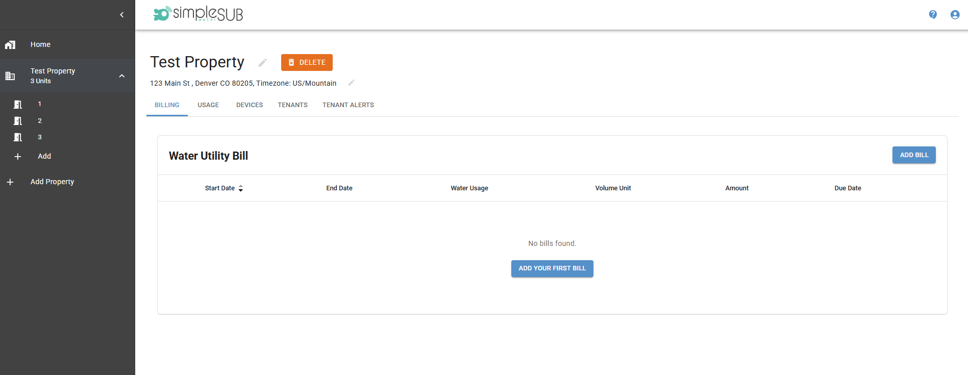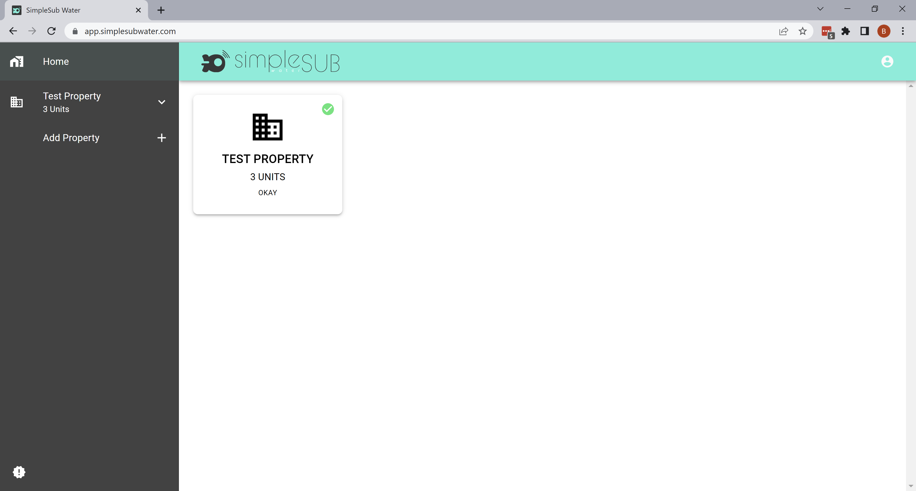 Once you've created your property, you will see the property on your home screen. I've created a test property with 3 units as an example: