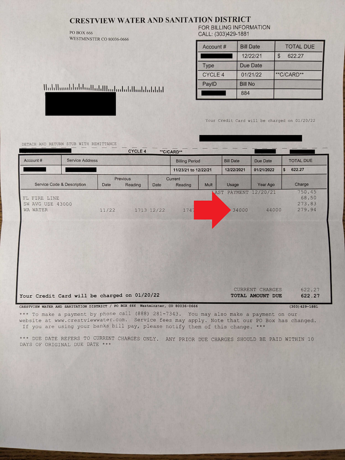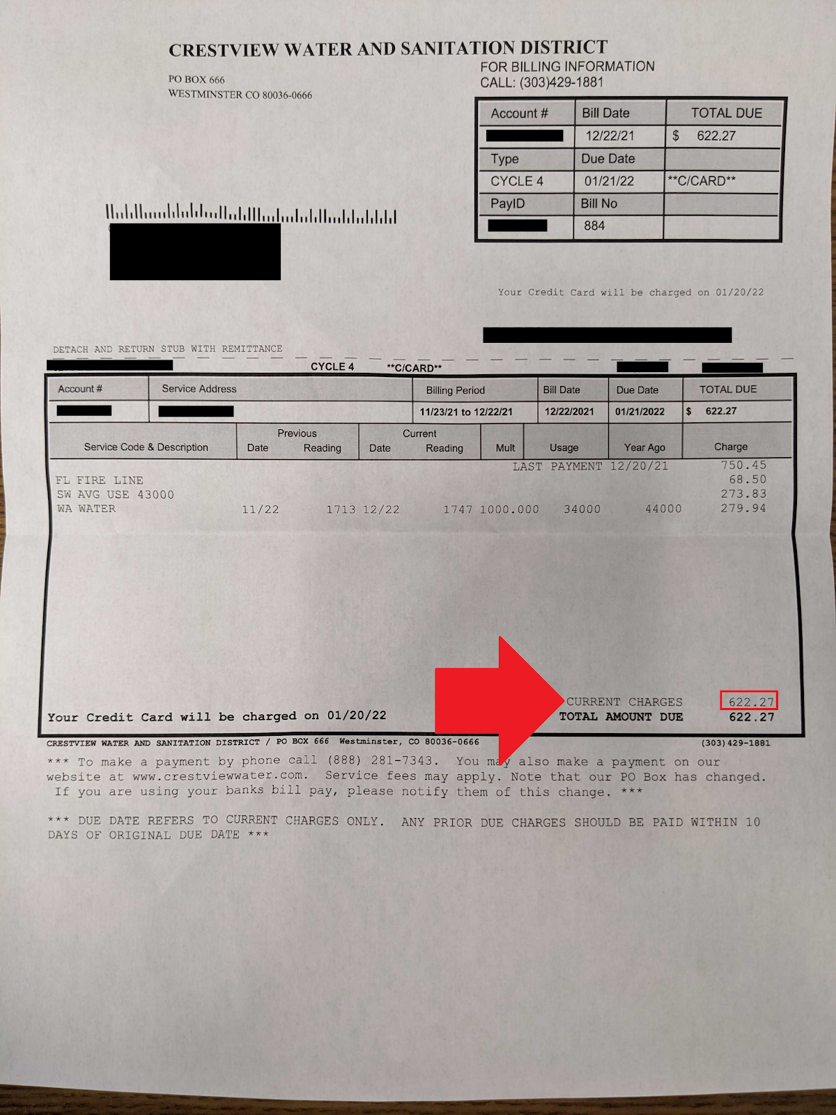 The next thing we need to find is the water usage that the utility measured over this billing period. You'll also need to find the units (typically thousands of gallons or CCF). This can be a little tricky to find. For residential tenants, expect to see ~2000 - 5000 gallons or ~3.2 - 8 CCF per unit. If you're not sure, call your water utility to verify. There should be a phone number to call on your bill.