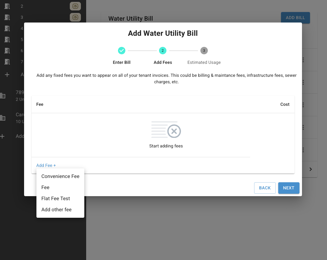 Select fee type (flat, split, or unit flat), name the fee, and enter the amount