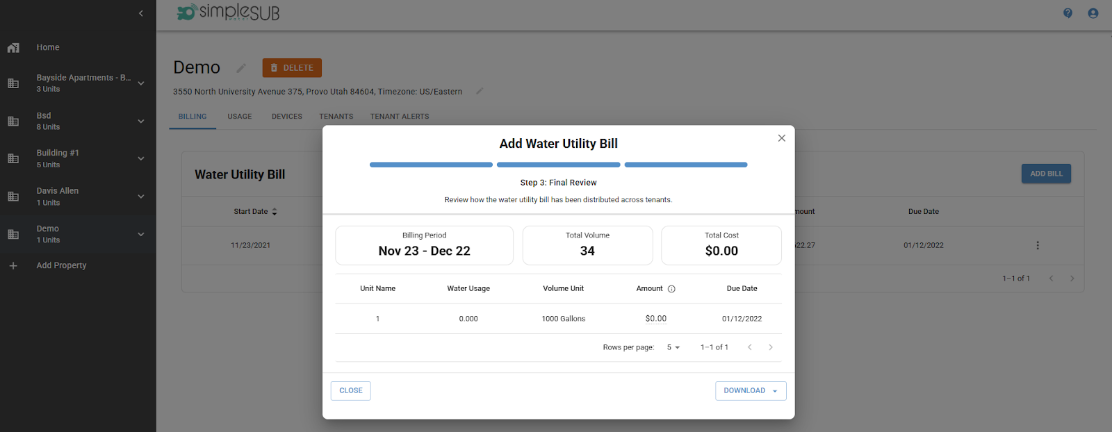 At first, tenant costs may appear as $0 if meters have not yet reported usage. Once meters are installed and collecting data, the report will automatically update to reflect actual usage. You can download this report as a CSV to import totals into your property management software, or use it to create your own invoices outside of the web app.