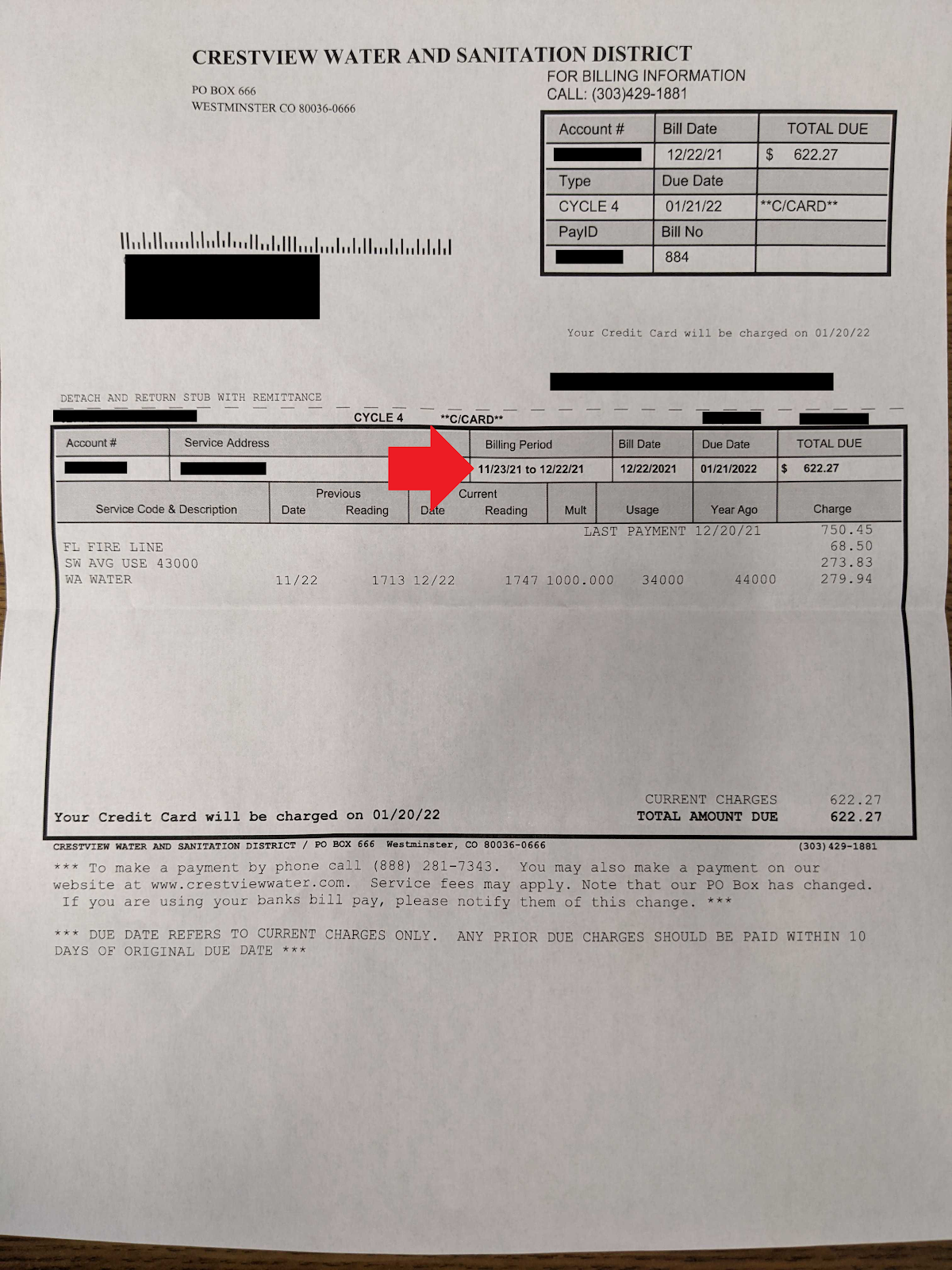 Let's look at our example water bill and find the information needed. First, look for a date range for the bill. In this case, it's called the Billing Period (note that all bills are a little different):