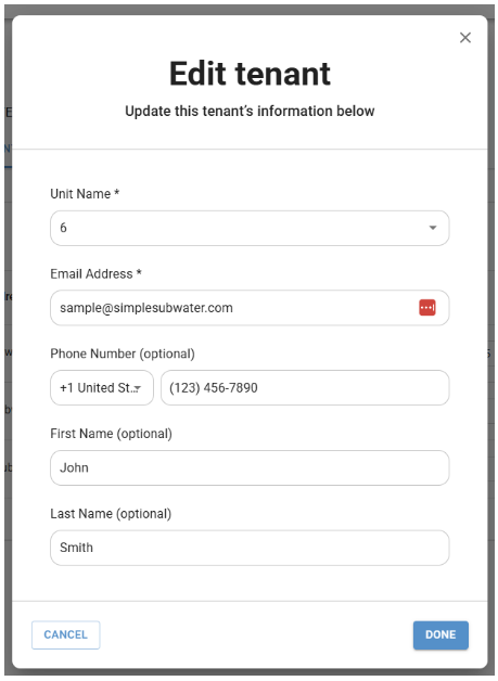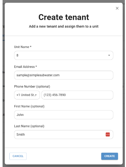 - To update an existing tenant, click the three vertical dots next to their name and select Edit Tenant. Add or update the phone number as needed.