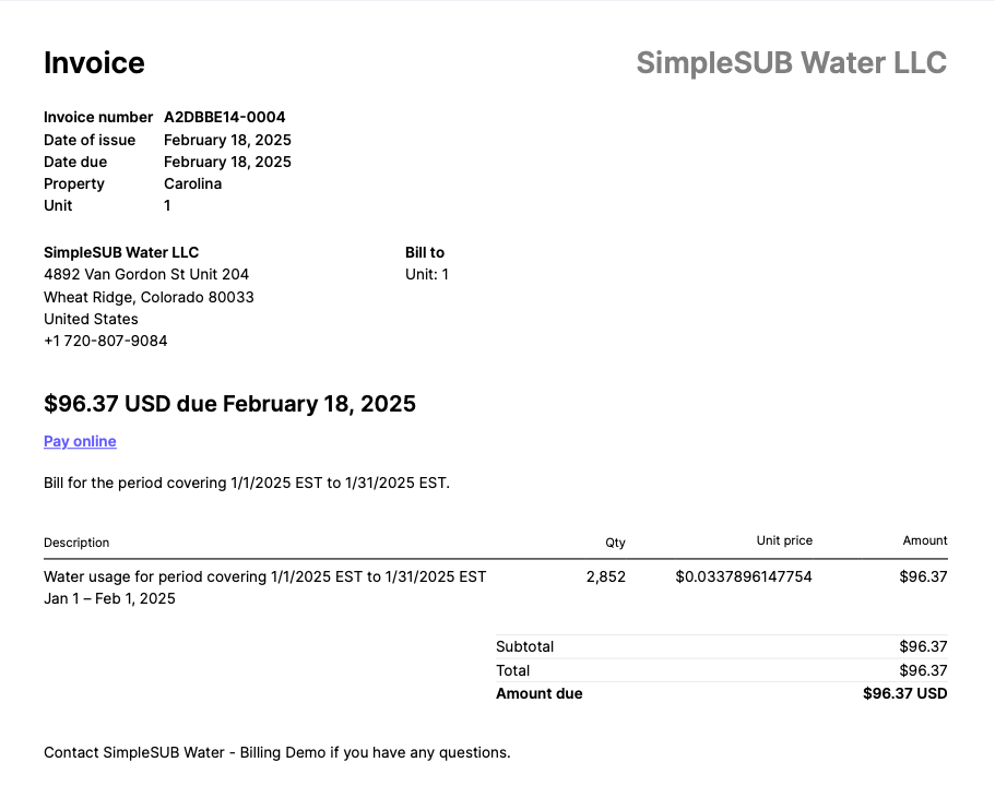 - Each tenant receives a bill with their share of the water and any additional fees.