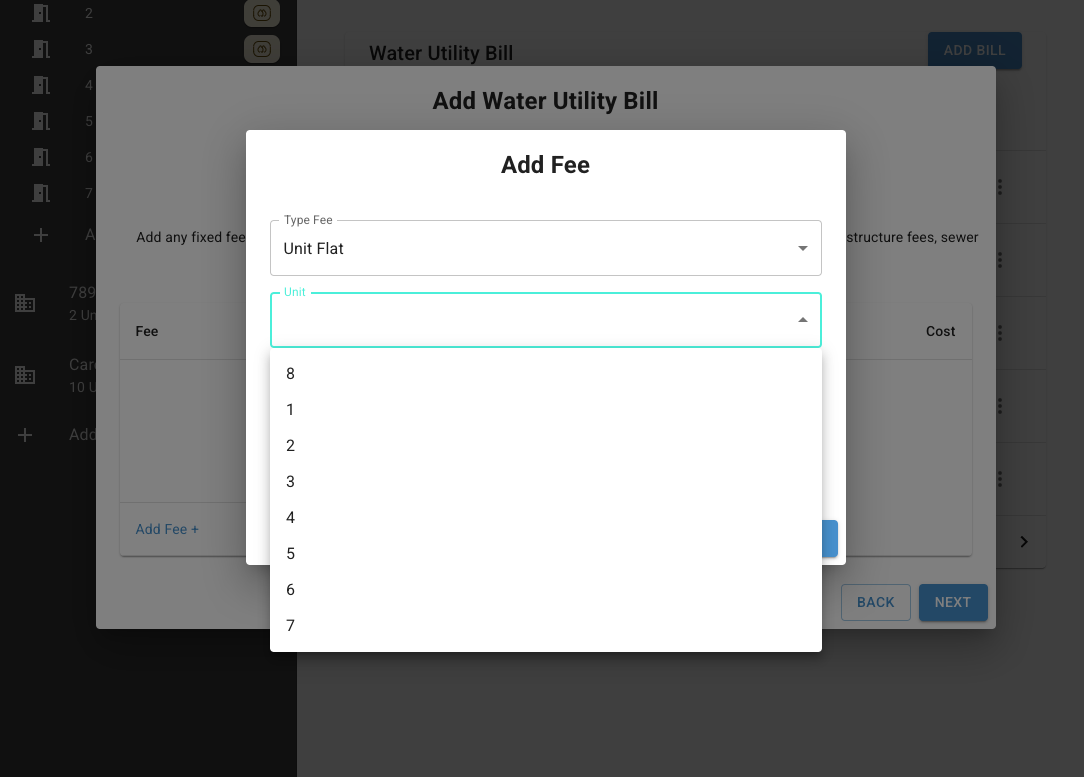 Select fee type (flat, split, or unit flat), name the fee, and enter the amount