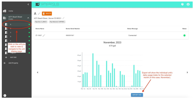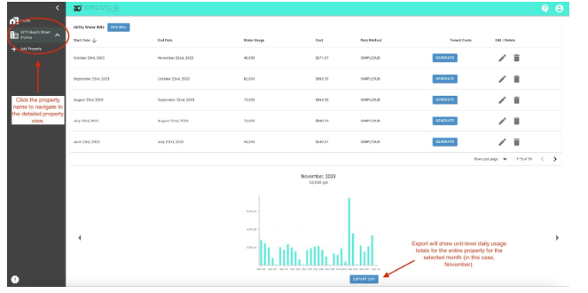 Property Usage Report: View daily usage totals for every unit on the property for the selected month. Accessible on the detailed property view, by clicking the property name in the web app and scrolling down to the bottom of the page, below the usage data chart.