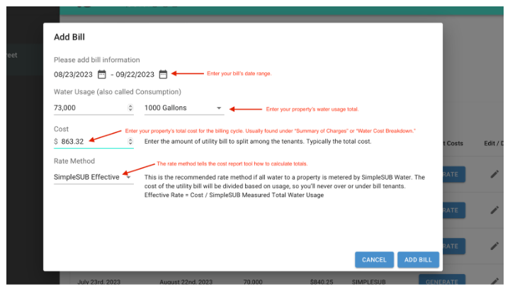 The cost report tool allows customers to input their utility bill information to generate unit-level cost reports for their property. The cost report tells SimpleSUB Water customers how much water each unit occupant used during a given billing cycle, and what they owe. Cost reports are generated using two inputs: automated Z1 Flow Meter meter readings and the customer’s utility bill information. In the graphic below, you’ll see a view of the cost report tool and the customizable inputs.