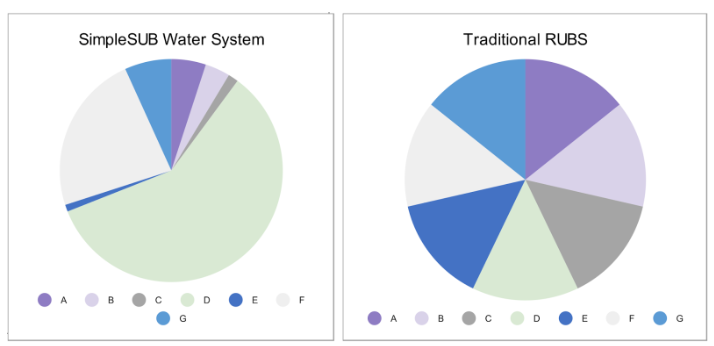 The charts below illustrate how water billing with the SimpleSUB Water solution compares to billing using traditional ratio utility billing systems (RUBS). Based on unit-level measurements, SimpleSUB Water’s cost reports generate fair bills. This side-by-side comparison makes it clear that using unit-level measurements creates equitability, while merely dividing a bill cannot.