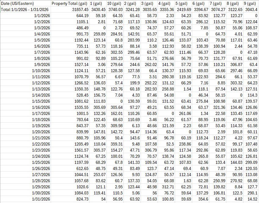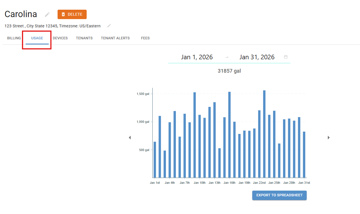 Property-level usage reports can be exported to a spreadsheet, showing a breakdown of usage across all units.
